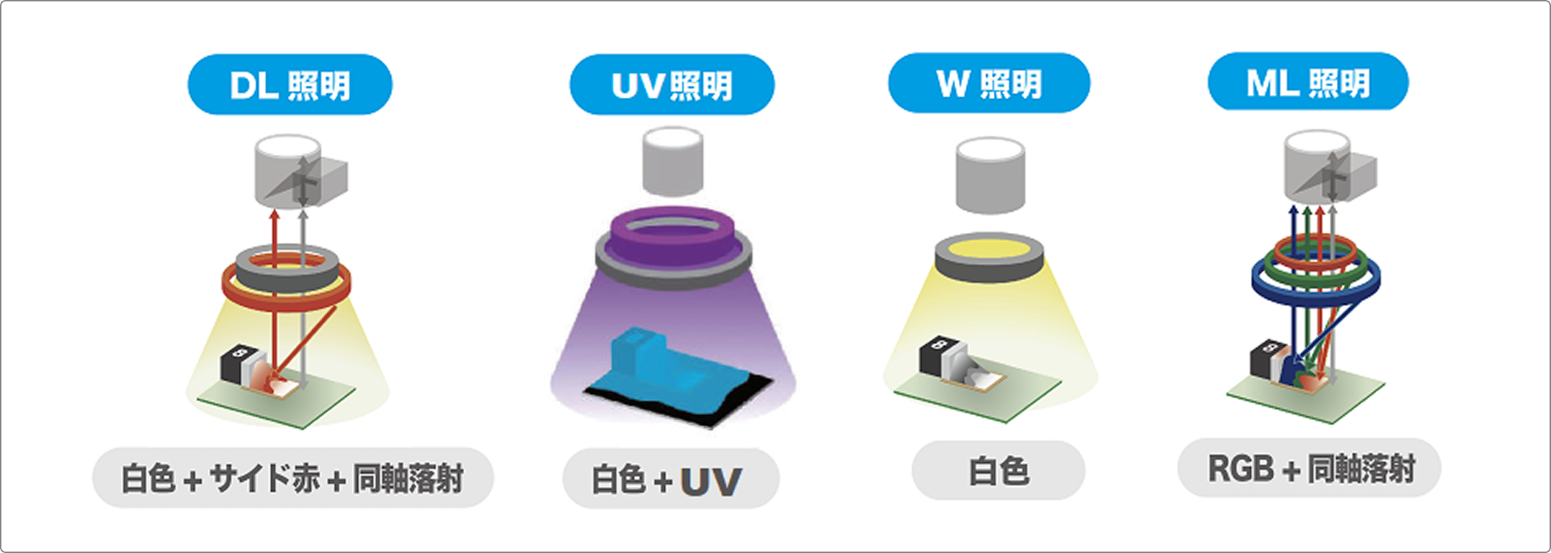 照明 | DL照明 or ML照明 / UV照明 / 白色照明 | DL照明 or ML照明 / UV照明 / 白色照明 | DL照明 or ML照明 / UV照明 / 白色照明 | 白色+サイド白+同軸落射 |