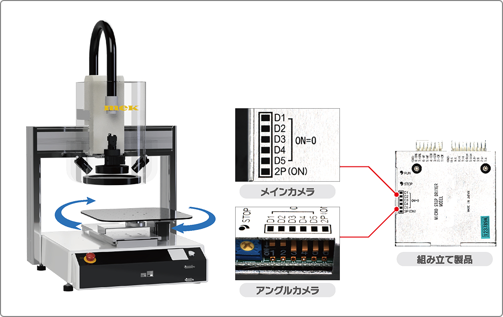 従来の直上検査をそのままに、「2アングルカメラ」と「回転テーブル」を搭載し多角検査を実現。